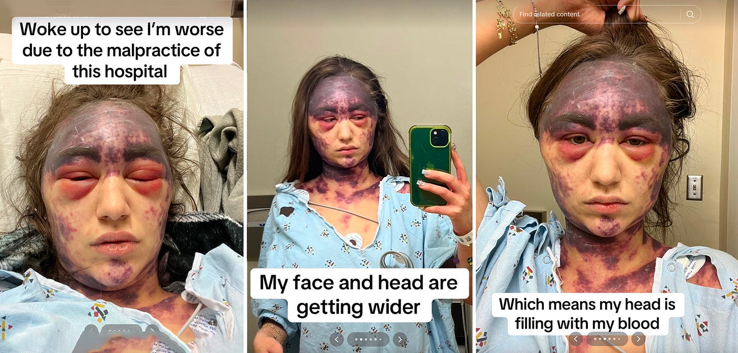 She has been filming herself and posting her cry for help out on her Instagram stories and TikTok cannel. Initially she let us know that she called the police for help, but they told her she was not suppose to call them for help - but then sent a bunch of police officers that work with the hospital showed up and told her that they couldn’t do anything to help her.