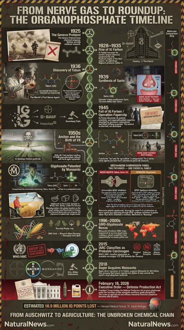 After World War II, the patents and knowledge from this chemical warfare program were, shall we say, “repurposed” for peacetime profit. The same class of chemicals—organophosphates—became the basis for a new generation of pesticides. By 1970, glyphosate emerged from this lineage, rebranded by Monsanto as a “revolutionary” weedkiller. The molecule was sanitized, given a friendly name, and sprayed onto the global food supply.