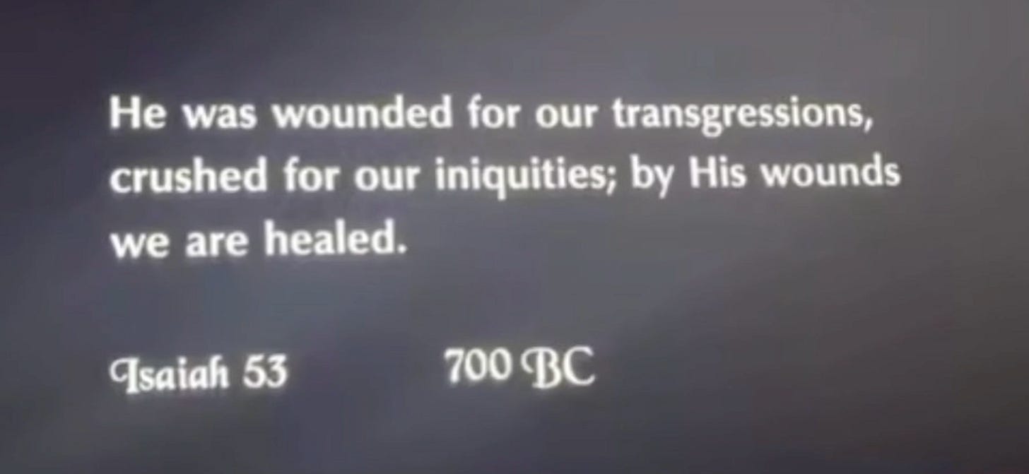 This verse is from Isaiah 53:5, and it sets the tone for the entire movie. It represents the core of the Christian message and clearly serves as Old Testament prophecy regarding the coming Messiah, Jesus Christ, who came to save His people from their sins.