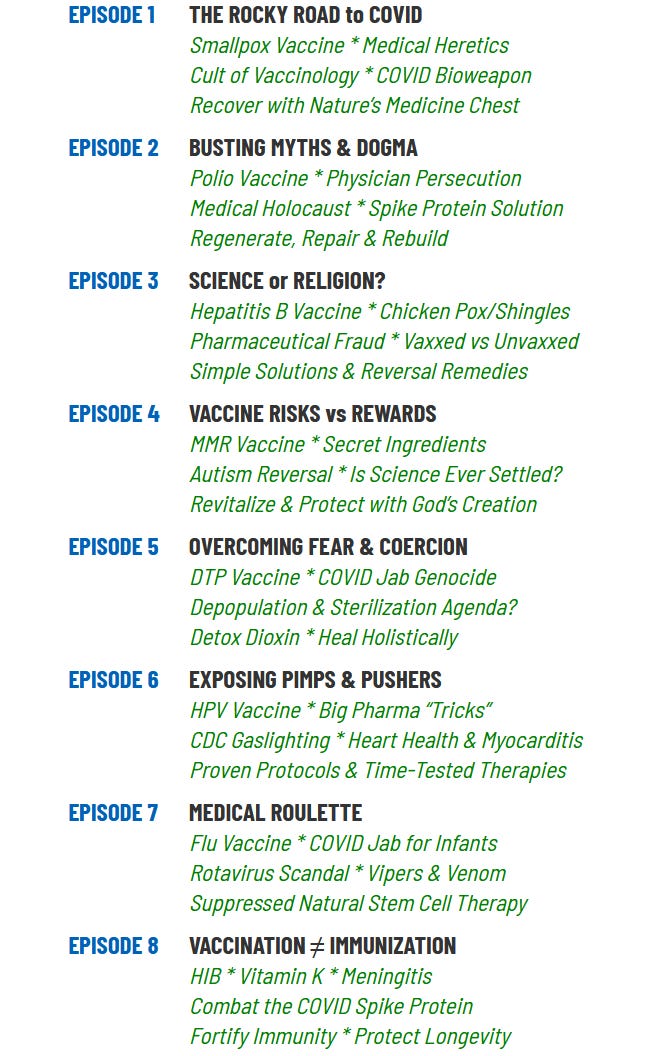 Beginning January 22nd, all eight powerful episodes will be available once again. This docu-series connects the dots on the origins of vaccines, the true roots of COVID-19, and the cult of “settled science” to real-world protocols for vaccine injury, spike-protein injury, and true holistic healing.