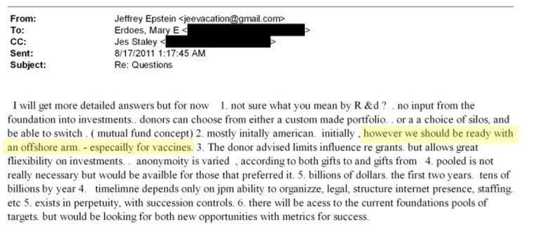By July 2011, the plan evolved. In an email to Staley, copying Boris Nikolic (Gates’ chief science advisor), Epstein laid out the core pitch: “A silo based proposal that will get Bill more money for vaccines.”